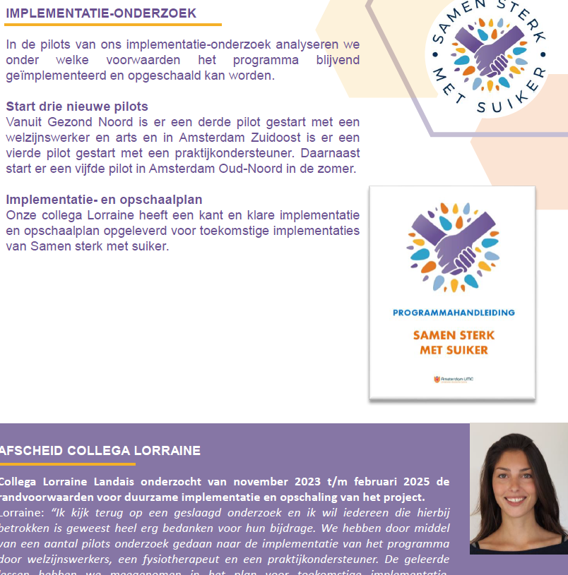 Samen Sterk met Suiker is een groepsprogramma met 27 bijeenkomsten. Het programma is voor mensen met suikerziekte (diabetes) type 2 die in begrijpelijke taal en in een groep willen leren hoe zij beter kunnen omgaan met hun suikerziekte.